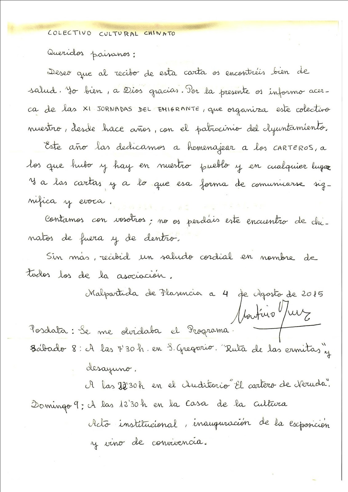 He aquí la carta con que el Colectivo informa a los chinatos acerca de las XI JORNADAS DEL EMIGRANTE. Una manera de comunicación familiar, sencilla, cercana, simpática. No hemos podido echarla en todas las casas, en todos los buzones, como nos hubiera gustado. Por eso la reproducimos en nuestras páginas de blog y de facebook, y así podrá ser leída por muchas personas a quienes también va destinada. Queremos que se cumpla lo que en la carta se expresa: que nadie se pierda el encuentro de las gentes chinatas en estas jornadas de convivencia, de esparcimiento y de cultura.